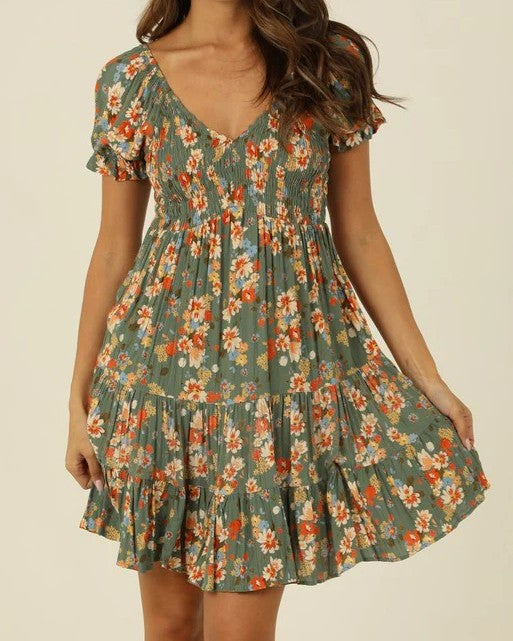 Step into fall with the Living The Dream Green Dress, designed to make every moment feel like a breeze. Featuring playful short sleeves and a flattering V-neck, this dress combines comfort with charm. The smocked elastic bust ensures a perfect fit, while the tiered skirt adds a flirty, twirl-worthy touch. Embrace the season in style and let your dreams take center stage!